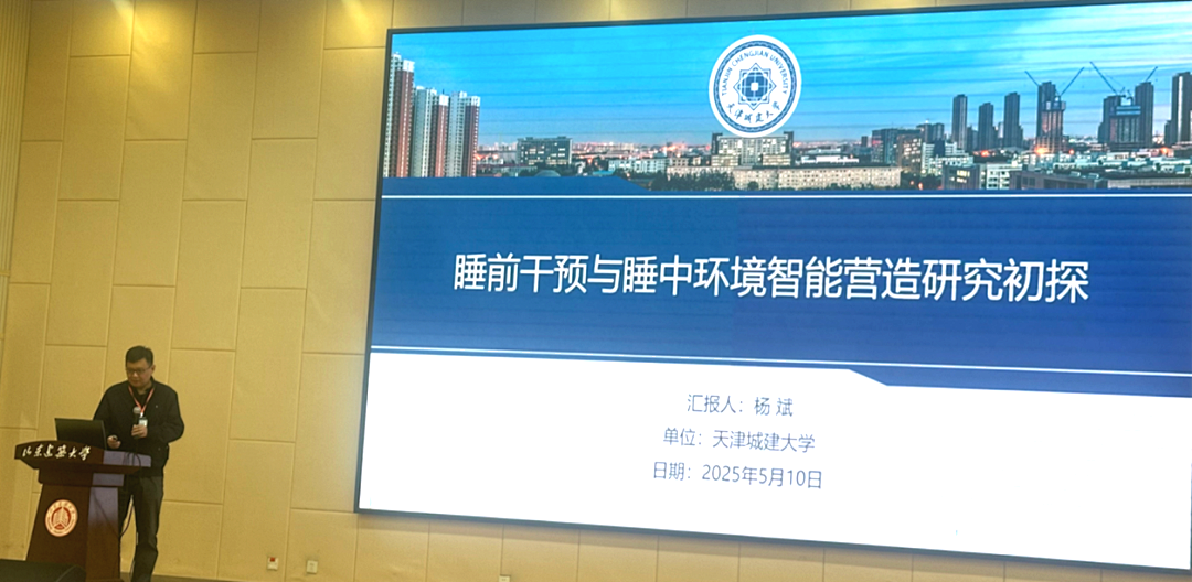 杨斌教授在大会主论坛受邀作题为《睡前干预与睡中环境智能营造硏究初探》的专家学术报告。报告介绍了课题组在睡前干预和睡中环境智能营造两方面的相关研究结果。他表示足浴和睡前使用手机会影响青年人群的睡眠质量,通过机器视觉实时非接触感知睡眠热感觉,并将睡眠热感觉引入卧室空调自控过程,可以实现复杂场景下每台空调设备所管辖区域的睡眠热感觉整体预测和评价,以及空调系统的智能化调控。