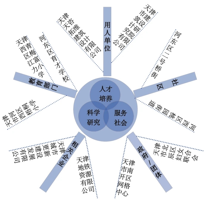 党支部立足高校“人才培养、科学研究、服务社会”三大职能,以业务共促为目标,通过“党员骨干牵手科研骨干、职能发挥赋能城市发展”的工作模式,形成服务天津相关政府部门、行业企业、用人单位、基层社区、教育部门的“三心五轴”党建联建格局。